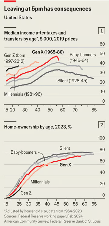 Although Gen Xers will in time escape the U-bend, they will remain losers in other ways. Consider their incomes. Gen Xers do earn more after inflation than earlier generations—the continuation of a long historical trend, and one from which both millennials and Gen Zers also benefit. But their progress has been slow. A recent paper by Kevin Corinth of the American Enterprise Institute, a think-tank, and Jeff Larrimore of the Federal Reserve assesses American household incomes by generation, after accounting for taxes, government transfers and inflation. From the ages of 36 to 40 Gen Xers’ real household incomes were only 16% higher than the previous generation at the same age, the smallest improvement of any cohort (see chart 1).