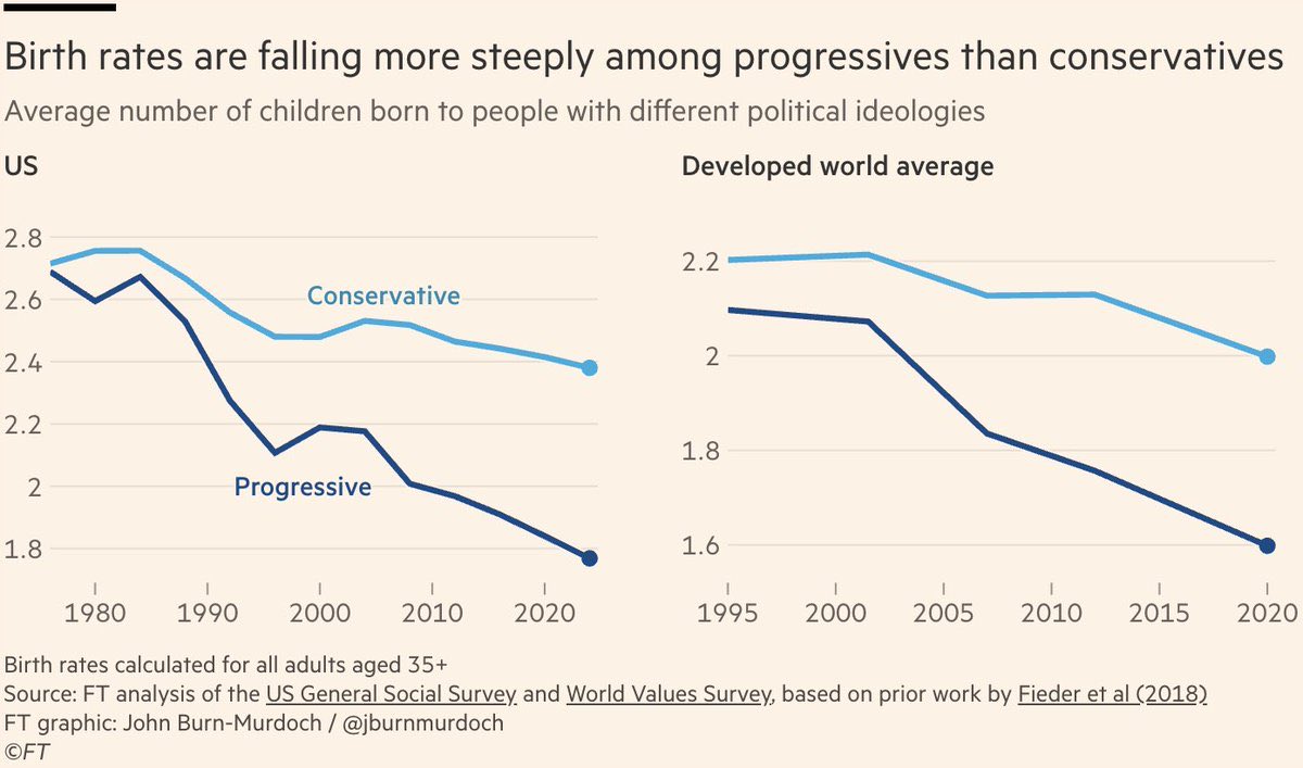 “From the US to Europe and beyond, people who identify as conservative are having almost as many children as they were decades ago,” Burn-Murdoch wrote. “The decline is overwhelmingly among those on the progressive left, in effect nudging each successive generation’s politics further to the right than they would otherwise have been.”