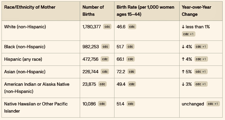 The conservative fertility edge shows up in state-level data. The 10 states with the highest 2023 birthrates were all Republican-majority states, led by South Dakota (2.01), Nebraska (1.92) and North Dakota (1.85). The bottom 10 were all “blue” states, with Vermont (1.30) at the bottom, and Oregon, Massachusetts, California, Washington and Illinois among those in the bottom pack. Paired with the trend of people migrating from blue states, it’s safe to say their lagging birthrates assure continued shrinkage in their congressional delegations, electoral votes and political power.